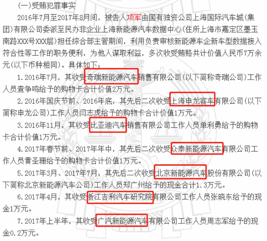 从裁判文书公布的信息来看,这两年多时间,为了通过新能源汽车车型符合性测试审核,有多达15家车企向项某实施行贿,行贿方式包括现金、购物卡等。