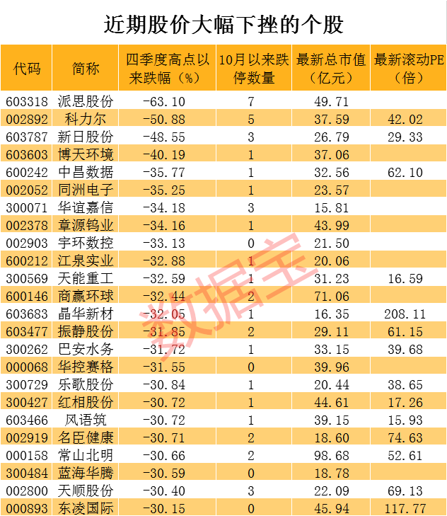 证券时报·数据宝统计显示,截至最新,剔除科创板股票后,已经有39只个股最新价较10月份以来最高价下跌超过30%。