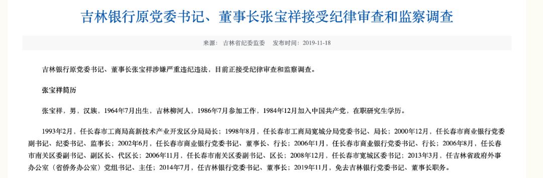 11月18日,据吉林省纪委监委官网称,吉林银行原党委书记、董事长张宝祥涉嫌严重违纪违法,目前正接受纪律审查和监察调查。