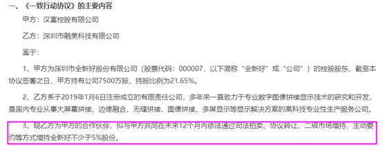 很快,11月16日,全新好的一则公告揭示了前任大股东汉富控股并不打算把这一位置轻易拱手让人,计划联手一致行动人融美科技共同在未来12个月内依法通过司法拍卖、协议转让、二级市场增持、主动要约等方式增持全新好不少于5%股份。