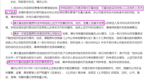 这次关注函主要是要求上市公司确认汉富控股以及实控人韩学渊是否已经失联,以及汉富控股的一致行动人融美科技是否持有公司股份等。