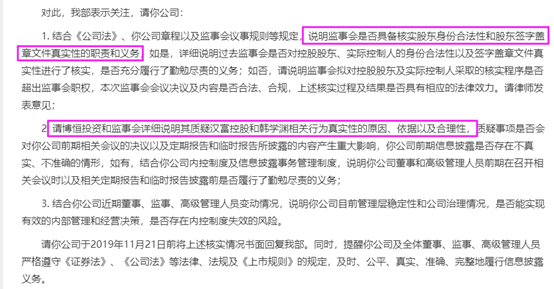 要求上市公司确认监事会是否举备核实股东身份合法性和真实性的职责和义务,并要求博恒投资提交质疑的真实原因、一句以及合理性。