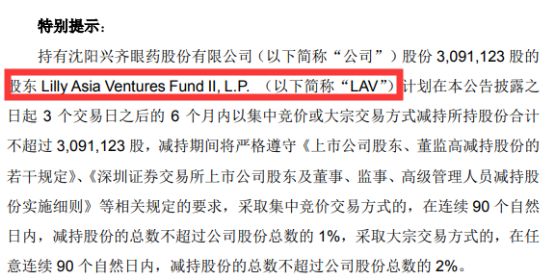 昨日晚间,兴齐眼药发布公告,持有公司股份3091123股的股东,Lilly Asia Ventures Fund II, L.P.(以下简称LAV),拟减持所持股份合计不超过3091123股。显然,这是一个清仓减持的公告。按照兴齐眼药最新收盘价88.08元计算,LAV本次计划套现的金额为2.72亿元。