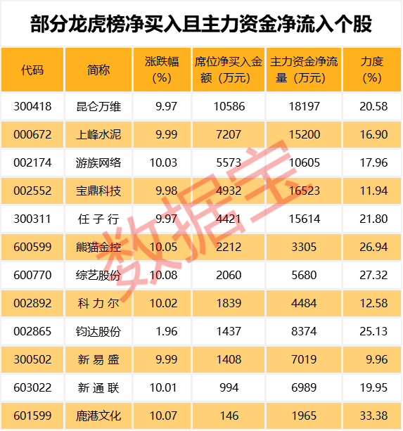 从盘口资金流向来看,主力资金净流入超千万且龙虎榜净买入个股共有12只,其中昆仑万维、宝鼎科技、任子行等个股资金净流入金额最大。净流入力度最大的个股有鹿港文化、综艺股份、熊猫金控,净流入力度分别为33.38%、27.32%、26.94%。