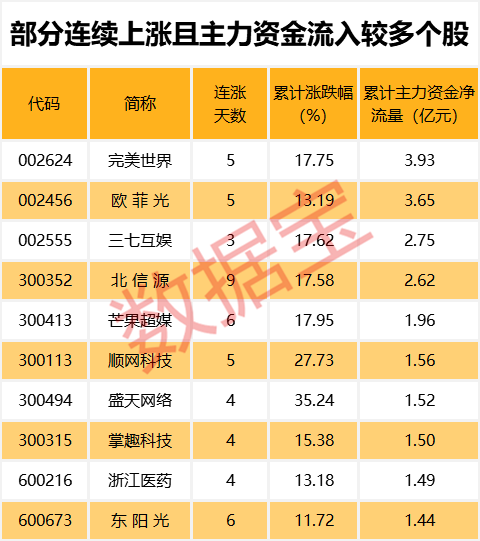 值得注意的是,287只连续上涨个股中,14只个股期间主力资金累计净流入超过亿元。其中,累计资金流入最多的为完美世界,主力资金累计流入3.93亿元。