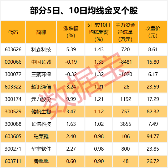 截至11月19日收盘,有72只A股的5日均线主动上穿10日均线,其中科森科技、中国长城、三聚环保等个股的5日均线较10日均线距离最大,分别达1.43%、1.33%、1.32%。