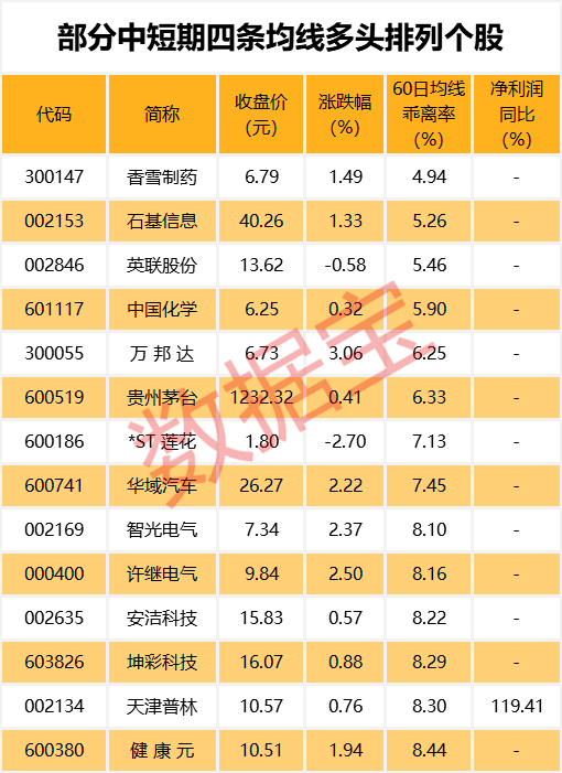 截至11月19日,106只个股5日、10日、20日、60日四条均线近日呈多头排列。其中香雪制药、石基信息、英联股份股价与60日均线的乖离率最小,分别为4.94%、5.26%、5.46%。