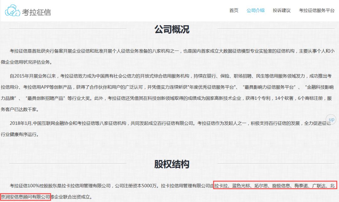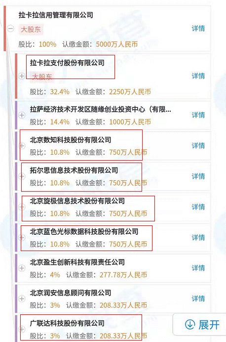 根据考拉征信的官网,考拉征信100%控股股东是拉卡拉信用管理有限公司,公司注册资本5000万。拉卡拉信用管理有限公司由拉卡拉、蓝色光标、拓尔思、旋极信息、梅泰诺(注:现名“数知科技”)、广联达、北京润安信息顾问有限公司等企业联合出资成立。这意味着,考拉征信背后的股东中,有多家A股上市公司的身影。