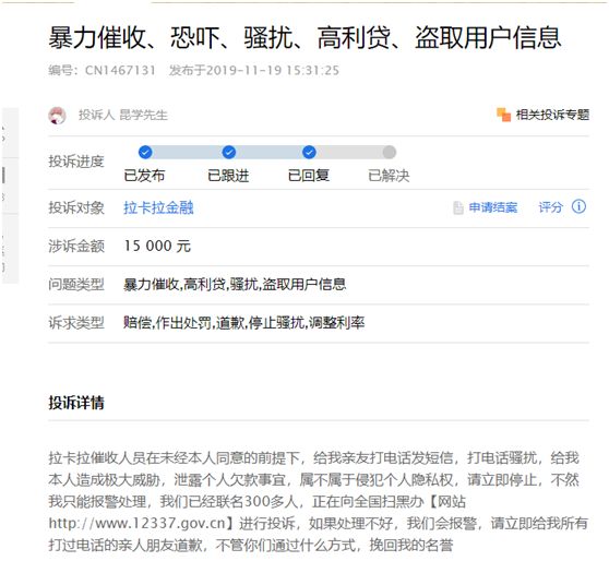 聚投诉上,拉卡拉的相关投诉达到1152条,被投诉最多的则是暴力催收,高利贷。其中投诉人昆学先生在聚投诉上表示,其在拉卡拉平台借款15000元,而拉卡拉在未经本人同意前提下,给亲友打电话发短信,并且泄露个人信息。