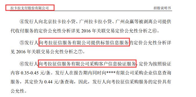 根据拉卡拉的过往公告,拉卡拉与考拉征信存在多项关联交易,比如2017年、2018年,拉卡拉均为考拉征信提供标签信息服务,以及向考拉征信采购客户信息验证服务。