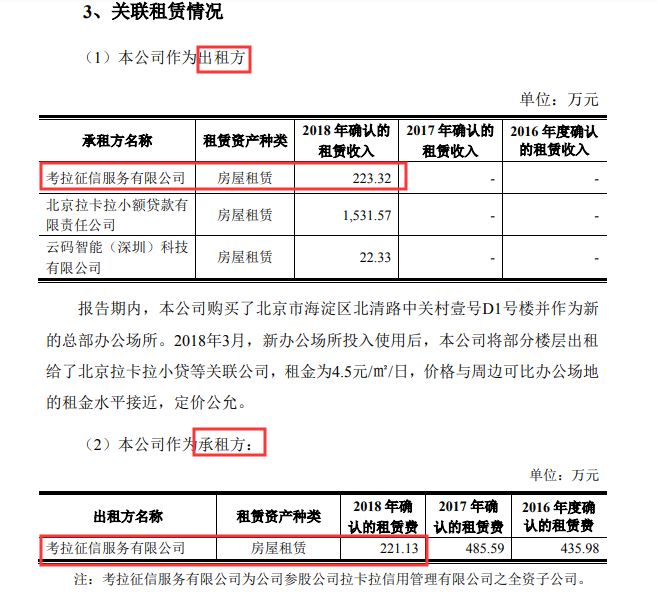 2018年,拉卡拉作为出租方,向考拉征信收取的房屋租赁收入为223.32万元,同时,拉卡拉又作为承租方,考拉征信支付的房屋租赁费用为221.13万元。
