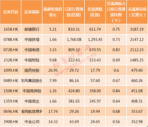 以下为H股未流通市值排名前十的个股: