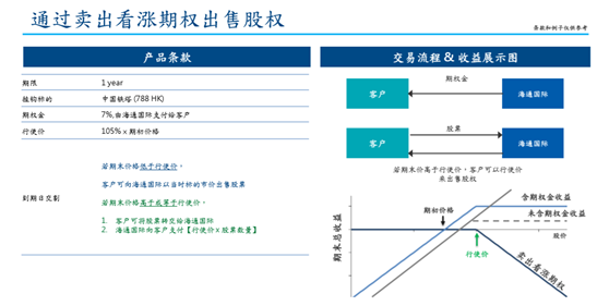 以中国铁塔为例,通过卖出看涨期权出售股权,比如期限1年,设定期权金7%,由海通国际支付给投资者,行使价为105%*期初价格。到期日交割,若期末价格低于行使价,投资者可向海通国际以当时标的市价出售股票,若期末价格高于或等于行使价,投资者可将股票转交给海通国际,海通国际向投资者支付行使价*股票数量的对应金额,从而完成套现。