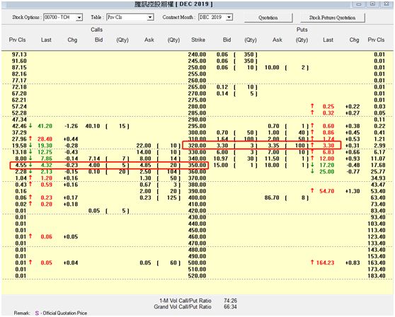 举个例子,腾讯的现价是335.6港元,12月行使价350港元的腾讯CALL期权金是4.32港元,而12月行使价320港元的PUT期权金是3.3港元。如果腾讯股价到期高于350港元,也只能用350港元的行使价卖出,如果腾讯股价低于320港元,即使跌倒100港元,依然可以用320港元的行使价沽出,即投资者输赢有限。
