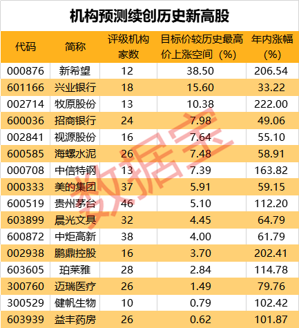 明年股市怎么走,各大券商已有自己的判断。在此,不妨通过综合各大券商机构的预测数据来看看个股未来走向。证券时报·数据宝统计显示,剔除次新股后,在近一个月曾创历史新高的120只股票中,有16只股票机构一致目标价较历史最高价更高(预测机构家数在10家以上),这意味着机构一致看好这些股票未来会继续创新高。