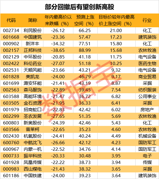 能创历史新高的股票始终是少数,绝大多数股票尚处在4月份小牛行情创出的高点之下。不过部分在经历了较大的回撤后,未来有可能再度创出新高。数据宝统计显示,剔除次新股后,在年内高点以来回撤超过20%的股票中,有44只股票机构预测未来股价将突破今年的高点(预测机构家数在10家以上)。