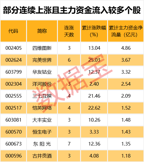 值得注意的是,482只连续上涨个股中,11只个股期间主力资金累计净流入超过亿元。其中,累计资金流入最多的为四维图新,主力资金累计流入4.86亿元。