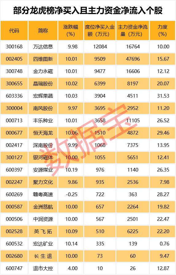 从盘口资金流向来看,主力资金净流入超千万且龙虎榜净买入个股共有15只,其中四维图新、万达信息、金力永磁等个股资金净流入金额最大。净流入力度最大的个股有宏辉果蔬、恒天海龙、赣粤高速,净流入力度分别为31.53%、29.46%、28.27%。