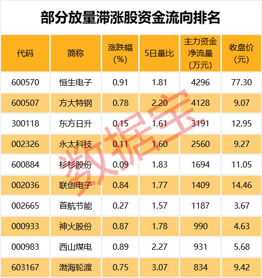 值得注意的是,94只放量滞涨股中,恒生电子、方大特钢、东方日升、永太科技等个股主力资金净流入最多,分别达到0.43亿元、0.41亿元、0.32亿元、0.26亿元。