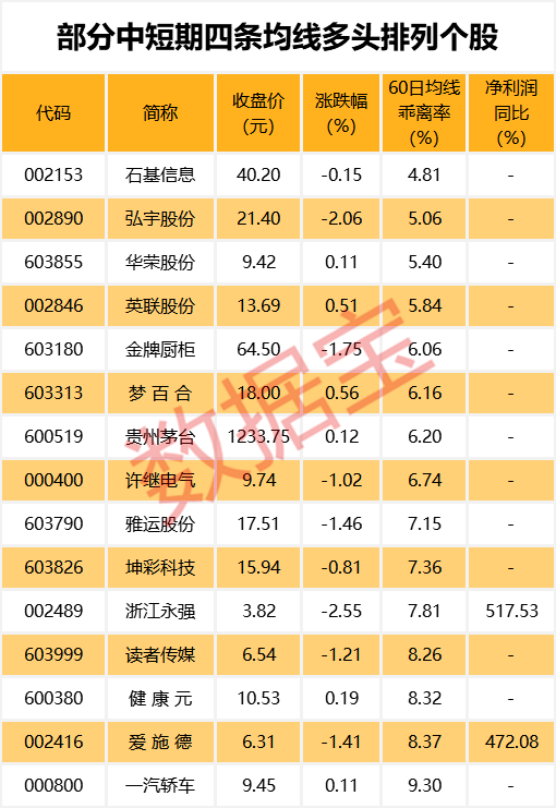 最新数据显示,两市有101只个股5日、10日、20日、60日四条均线近日呈多头排列。其中石基信息、弘宇股份、华荣股份股价与60日均线的乖离率最小,分别为4.81%、5.06%、5.40%。