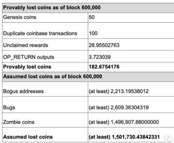 按照Coin Metrics的最新报告,主要将丢失的比特币分为两类计算:可证明丢失的比特币与可能丢失的比特币。可证明丢失的比特币意味着能被证实永久丢失,可能丢失则代表极大概率永久丢失。其中,可证明丢失的比特币包括创世币(最初产出的比特币),重复交易,无人认领的采矿奖励和OP_return输出(脚本操作码,用于承载额外交易信息)。
