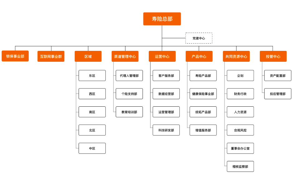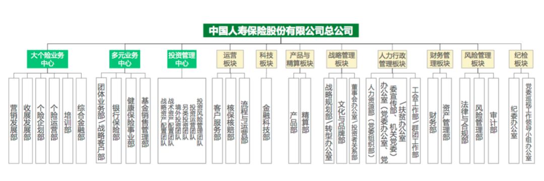 中国人寿今年下半年刚完成组织架构调整,更加突出前中后台的概念,总体方向是强化前台、优化中台、精简后台。最新组织架构中,前台包括三大中心,中后台包括8个板块,下设部门30个,部门数较此前有所减少。前台新建立了大个险业务中心,这是在过去个险营销一个部门之上,扩展为六个部门,即包括营销、收展、教育培训等。