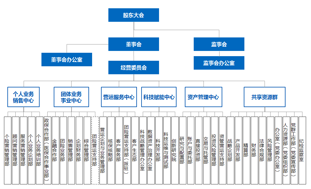 新华保险官网披露,董事会下设六大委员会,总部部门共计28个,另有合肥后援中小和35家分公司,总部包括个险销售部、银行业务部、团体业务部、健康保险事业部等业务部门。