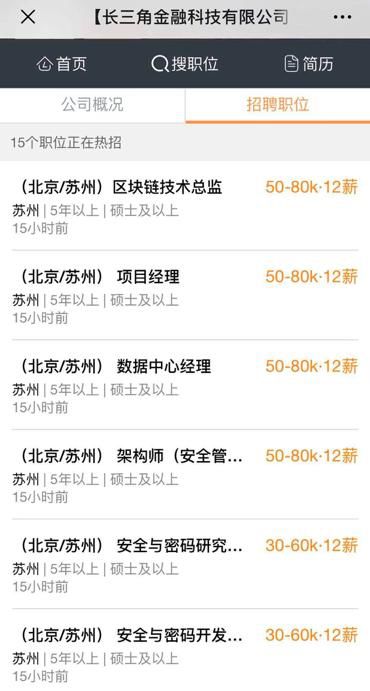 据此次长三角金融科技有限公司主要招聘岗位主要包括数据中心经理、安全与密码研究专员、高级网络工程师、架构师(平台、移动)、区块链技术总监、区块链架构师、区块链研发工程师、大数据研发工程师等,据悉,这些职位最少月薪5万。