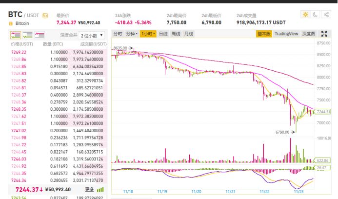 在过去24小时,数字货币上演集体暴跌。币安行情软件显示,比特币最低跌至6790美元,为6个月来最低水平,截至记者发稿,比特币价格报7244美元,24小时内跌410.63美元,即一枚比特币就蒸发了人民币2874元。