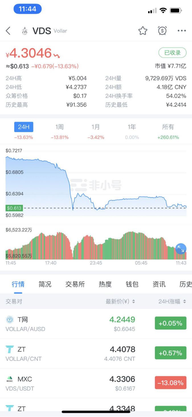 在看到抹茶交易所上线VDS带来的实际效益后,Biki也开始上线VDS,依靠传销盘进行引流。VDS在Biki上线之后经过短暂的猛涨,触及12美元高点后便急速下调。截至11月23日,VDS价格显示为0.613美元(约人民币4.877元),累计跌幅最高达95%。