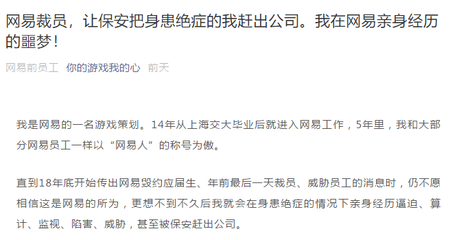 这两天,网易刷屏了,一篇关于“网易裁员,让保安把身患绝症的我赶出公司。我在网易亲身经历的噩梦”的文章在社交平台刷屏。作者自述是来自网易的一名游戏策划。14年从上海交大毕业后就进入网易工作,在网易工作5年,在身患绝症的情况下亲身经历逼迫、算计、监视、陷害、威胁,甚至被保安赶出公司。