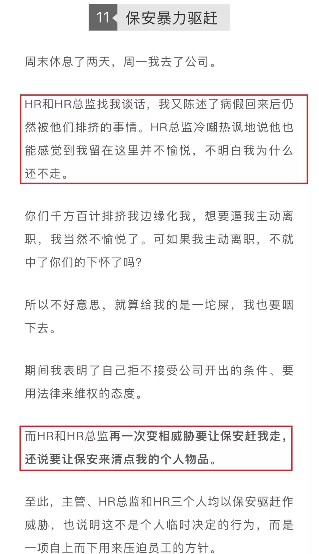 该员工在文章中称,在与网易公司几个月的交涉中,受到了网易游戏包括强行挑刺、被早退以及旷工威胁等不公平待遇。杨保全表示,在类似这样的纠纷中,也有公司存在恐吓员工的情况,有些员工法律意识很强,拒不接受公司的辞退要求,公司也未必就敢单方面向员工发出解除合同的通知。