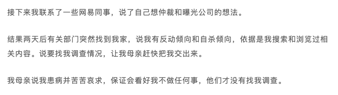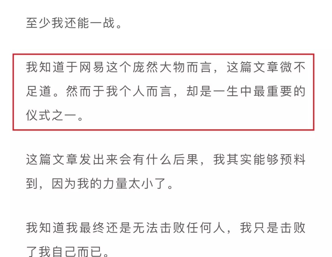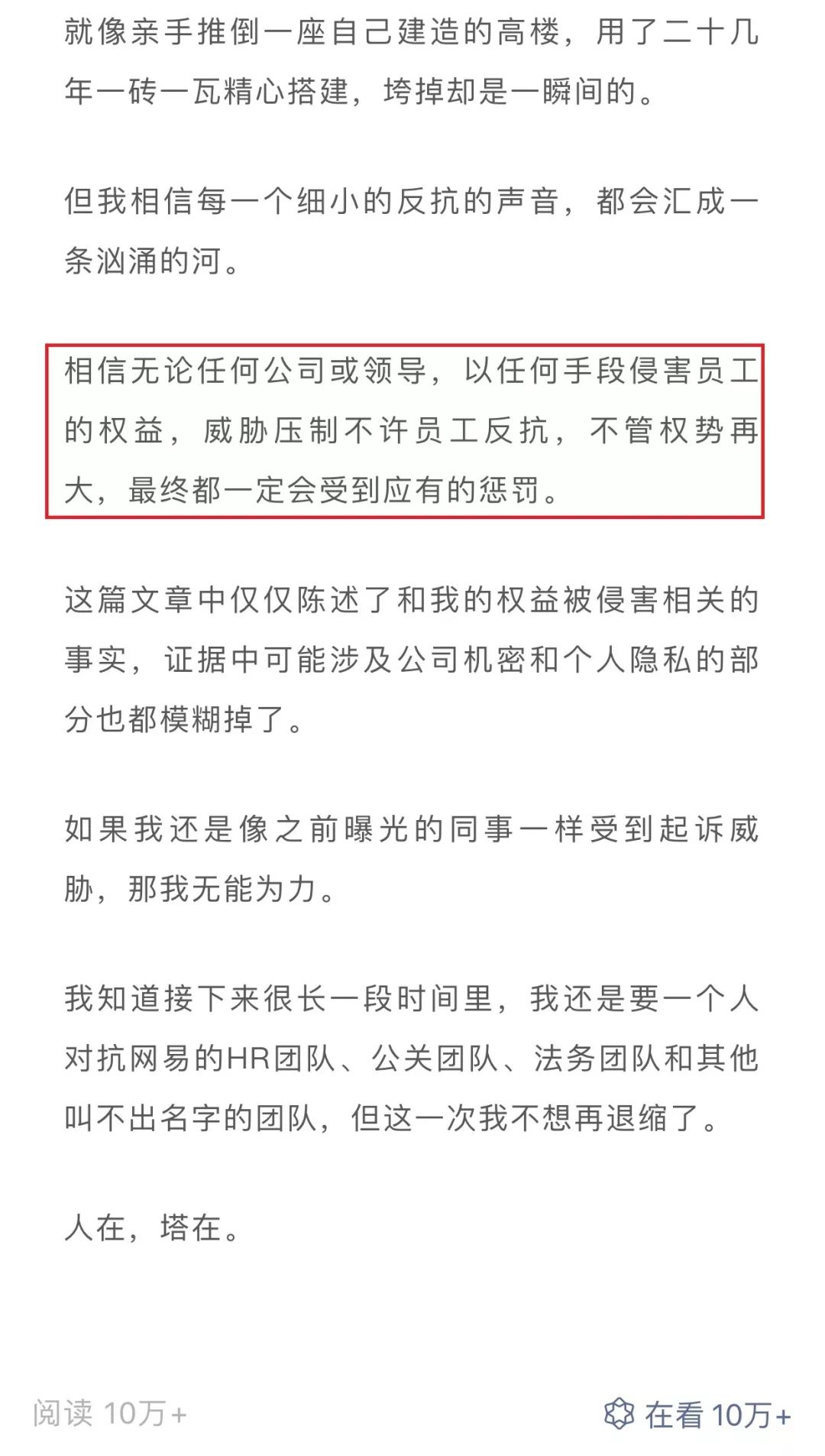 最后,该控诉者写道:“我知道接下来很长一段时间里,我还是要一个人对抗网易的HR团队、公关团队、法务团队和其他叫不出名字的团队,但这一次我不想再退缩了。人在,塔在。”