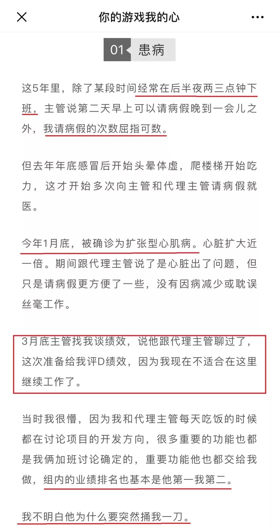 该控诉者称,在这5年里,除了某段时间经常在后半夜两三点钟下班,主管说第二天早上可以请病假晚到一会儿之外,请病假的次数屈指可数。但去年年底感冒后,他开始头晕体虚,爬楼梯开始吃力,这才开始多次向主管和代理主管请病假就医。今年1月底,被确诊为扩张型心肌病,心脏扩大近一倍。