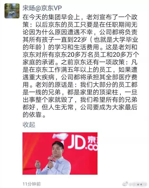 而同时,京东的刘强东老师也被刷屏了,今天上午,刘强东宣布,未来京东员工只要是在任职期间遭遇任何不幸,京东都将负责其所有孩子一直到22岁的学习和生活费用。