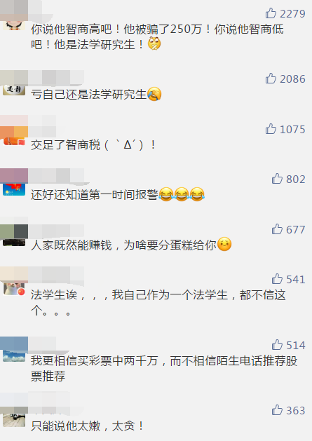 一般印象中,轻信荐股电话的都是文化水平不高、法律意识浅薄、甚至有点“糊涂”的人,如今法学院的研究生被骗,而且被骗金额巨大,是不是听起来有点荒唐?对此,网友也纷纷表示震惊: