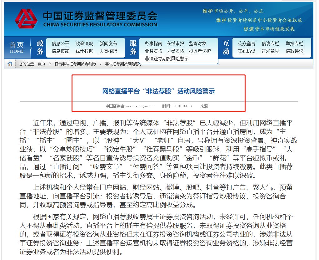 2018年9月,证监会发布网络直播平台“非法荐股”活动风险警示。