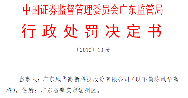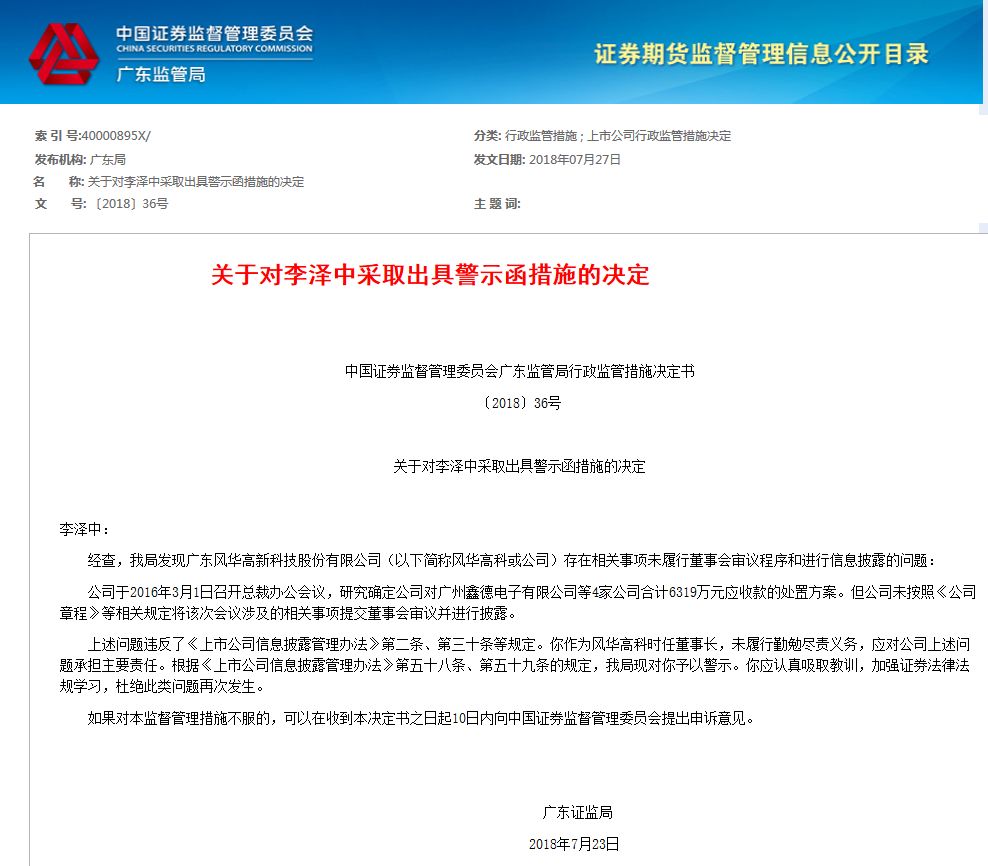 早在2018年7月,由于信披延期,深交所就已对风华高科下发监管函,且广东证监局对王广军、王金全、李泽中等6名相关负责人就已出具警示函,原因包括信披延期和应收账款处理事项未进行信披,对此次处罚进行提前预告。