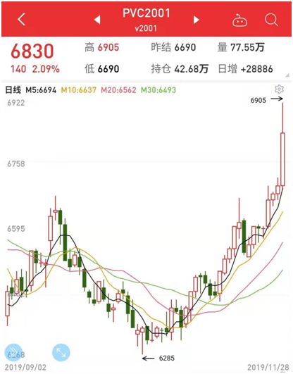今日,PVC期货主力2001合约开盘后一路上涨,收涨2.09%,盘中最高价6905元/吨,刷新了近半年价格新高。