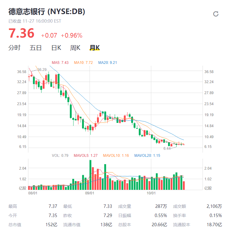 从股价表现来看,德意志银行股价为7.3美元。而翻开历史来看,从2007年一度飙升到159美元,到如今7.3美元,德银用了十二年时间,成功实现了从三位数到一位数的转变。