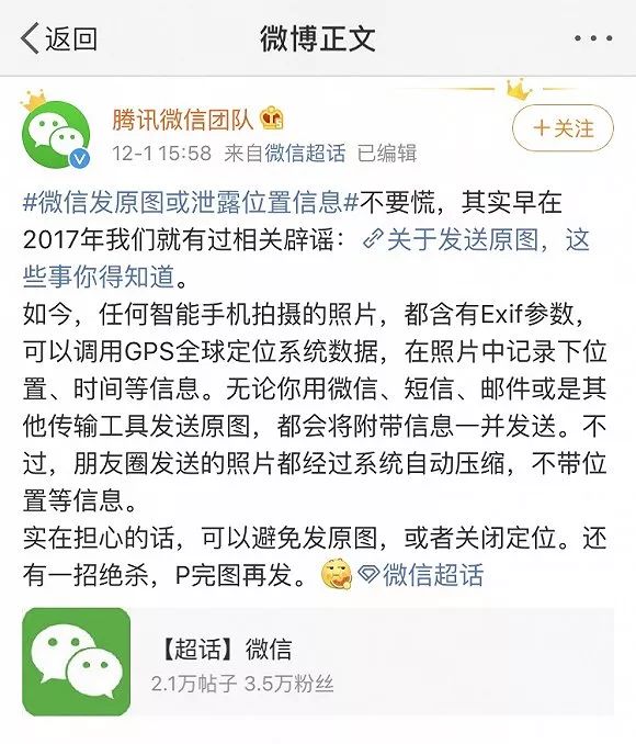 针对此事,12月1日下午4点,腾讯微信团队在微博回应“微信发原图或泄露位置信息”。