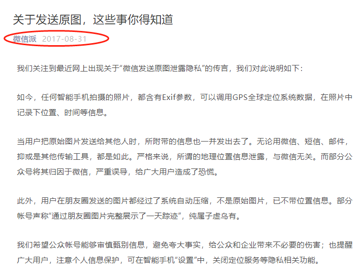 当用户把原始图片发送给其他人时,所附带的信息也一并发出去了。无论用微信、短信、邮件,抑或是其他传输工具,都是如此。严格来说,所谓的地理位置信息泄露,与微信无关。而部分公众号将其归因于微信,严重误导,给广大用户造成了恐慌。
