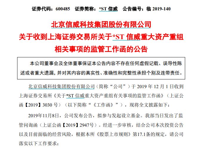 在12月的第一天,*ST信威再次收到来自上交所的监管工作函。