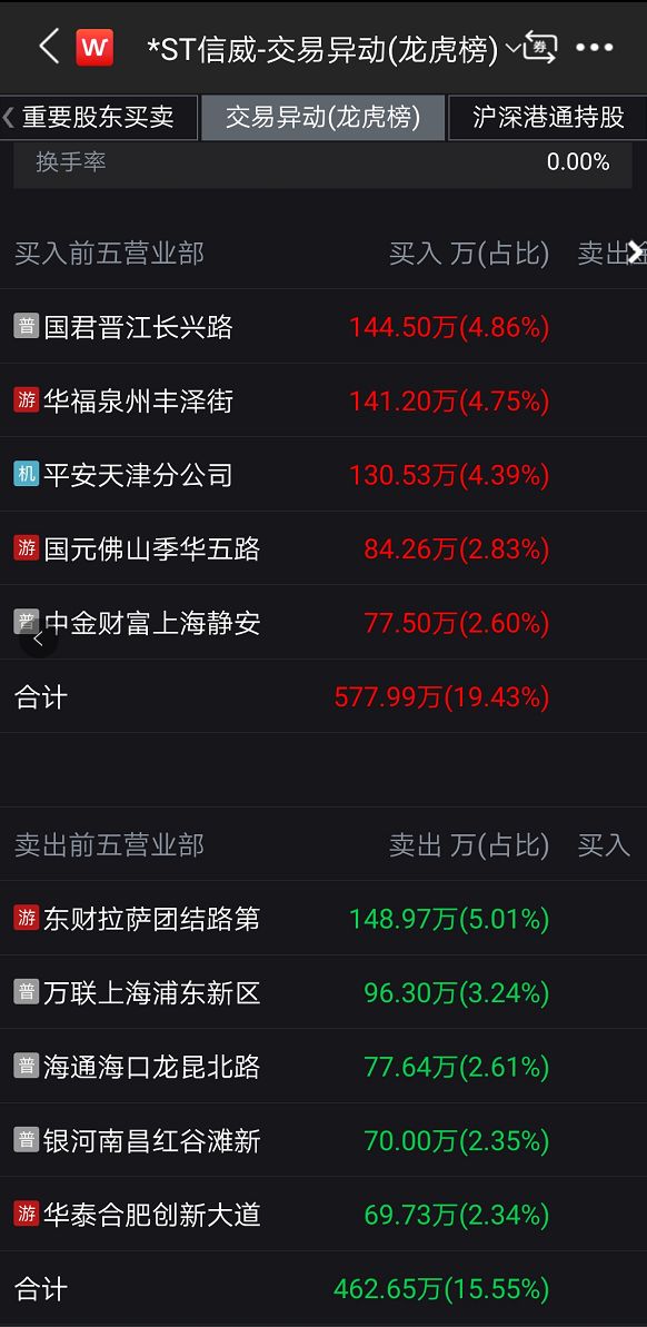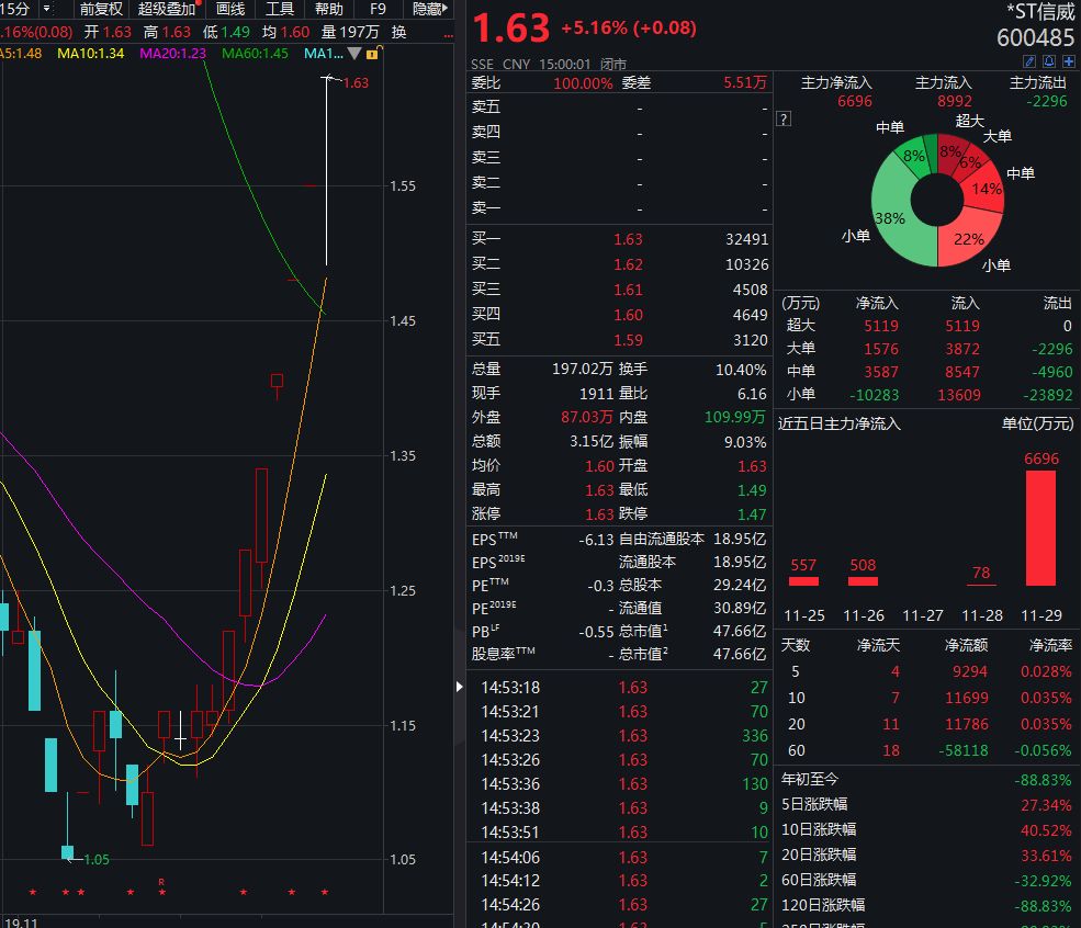 11月29日,*ST信威股价达到1.63元/股,当日涨幅为5.16%;最近5日涨幅为27.34%,10日涨幅达到40.52%。11月28日,*ST信威登上龙虎榜,在买入卖出十个席位中,共有4个游资席位,其中著名的东方财富拉萨团结湖第二营业部赫然在列。