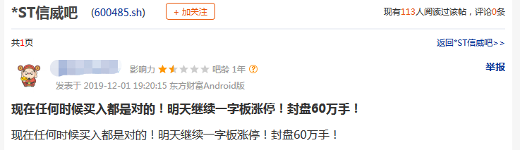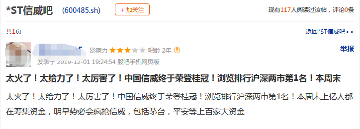然而,再多的风险提示都拦不住执着的投资者。在*ST信威股吧中,近期有多个疯狂炒作声音传出,如“任何时候买都是对的,明天继续一字涨停”、“军工战略第一股”、“20块见”等,更有多名投资者跟帖称“愿赌服输”、“赌就对了”,对*ST信威“身负战略使命”深信不疑。
