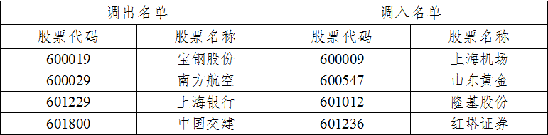在这次样本调整中,上证50指数更换4只股票,上海机场、山东黄金、隆基股份、红塔证券进入指数,宝钢股份、上海银行、南方航空、中国交建被调出指数。