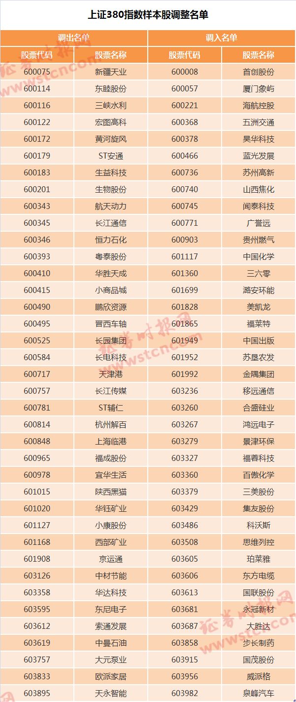 同步调整的还有上证180、上证380等指数。其中上证180指数更换18只股票,恒力石化、上海临港等股票进入指数,三六零、养元饮品等股票被调出指数;上证380指数更换38只股票,闻泰科技、中国化学等进入指数,长电科技、欧派家居等被调出指数。