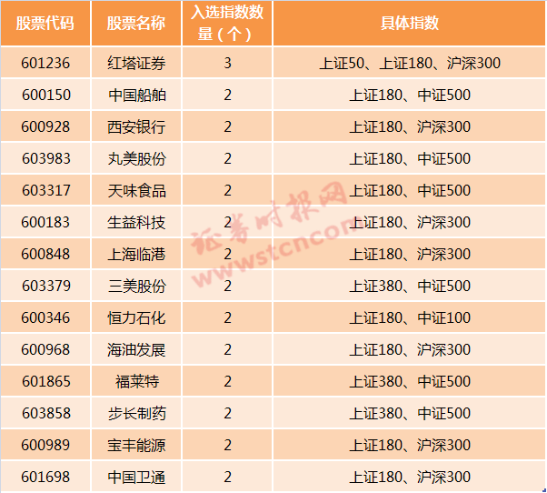 通过梳理入股个股的名单发现,14只个股将被纳入两个或以上指数。其中红塔证券入选的指数数量最多,达3个,分别是上证50、上证180和沪深300。剩余的13只个个股均入选两个指数。这意味着剔重处理后,共有115只个股被调入上述指数,成为相关指数基金的必配标的。
