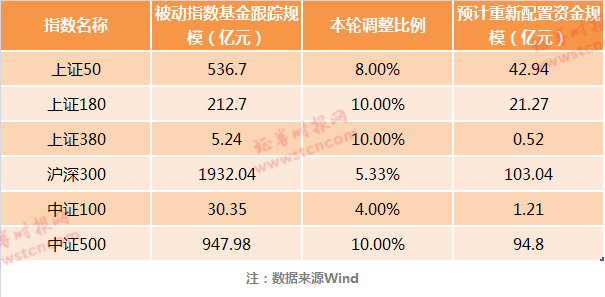 证券时报记者统计发现,目前跟踪上证50、上证180、上证380、沪深300、中证100、中证500等6大指数的被动型指数基金规模合计高达3665亿元。若以调整比例以及跟踪的被动指数规模简单计算,本次调整预计有263.78亿元资金将会被动配置至新纳入个股。