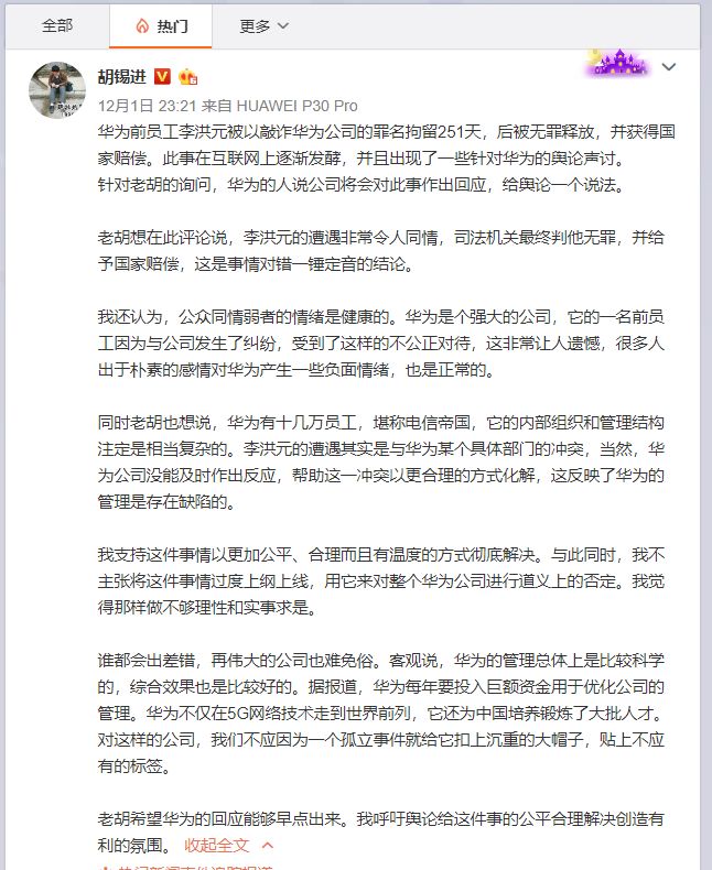 胡锡进表示,支持这件事情以更加公平、合理而且有温度的方式彻底解决。与此同时,不主张将这件事情过度上纲上线,用它来对整个华为公司进行道义上的否定。客观说,华为的管理总体上是比较科学的,综合效果也是比较好的。据报道,华为每年要投入巨额资金用于优化公司的管理。华为不仅在5G网络技术走到世界前列,它还为中国培养锻炼了大批人才。对这样的公司,不应因为一个孤立事件就给它扣上沉重的大帽子,贴上不应有的标签。